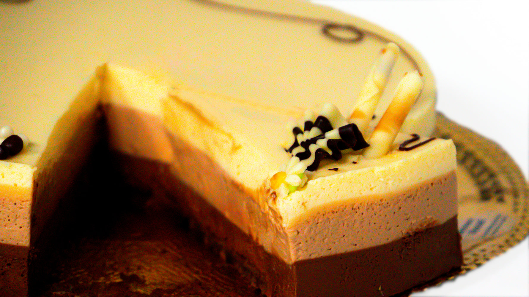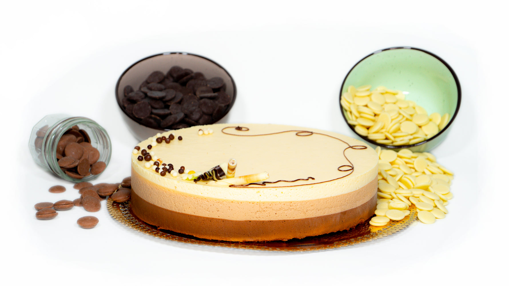 Partimos de una base intensa de chocolate puro, profunda y ligeramente amarga, que aporta carácter y estructura. Sobre ella, una capa cremosa de chocolate con leche equilibra el conjunto con suavidad y redondez. Finalmente, coronamos la tarta con una delicada mousse de chocolate blanco que aporta ligereza y un toque dulce perfectamente medido.